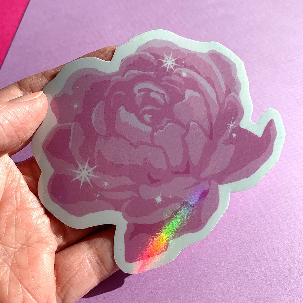 This sticker measures about 3.5" by 3". These are holographic vinyl stickers with an additional layer of protective glossy laminate, so they should stand up to some abuse and water, but no guarantees, sorry folks.