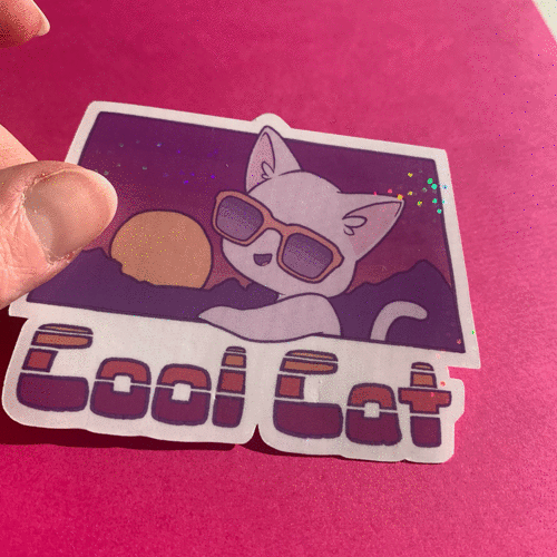 This sticker measures about 3.5" by 2.5". These are vinyl stickers with a sequin rainbow holo layer of laminate, so they should stand up to some abuse and water.